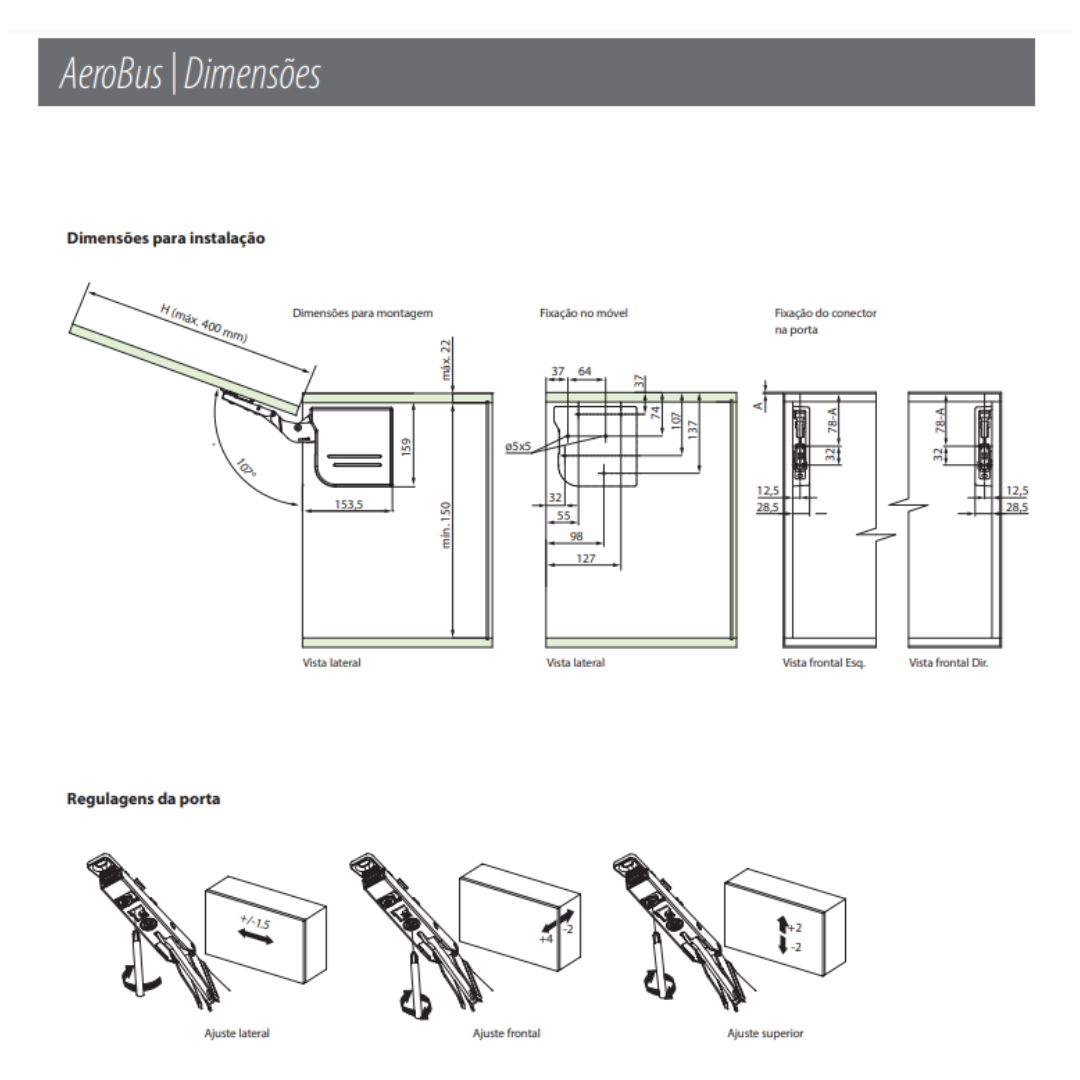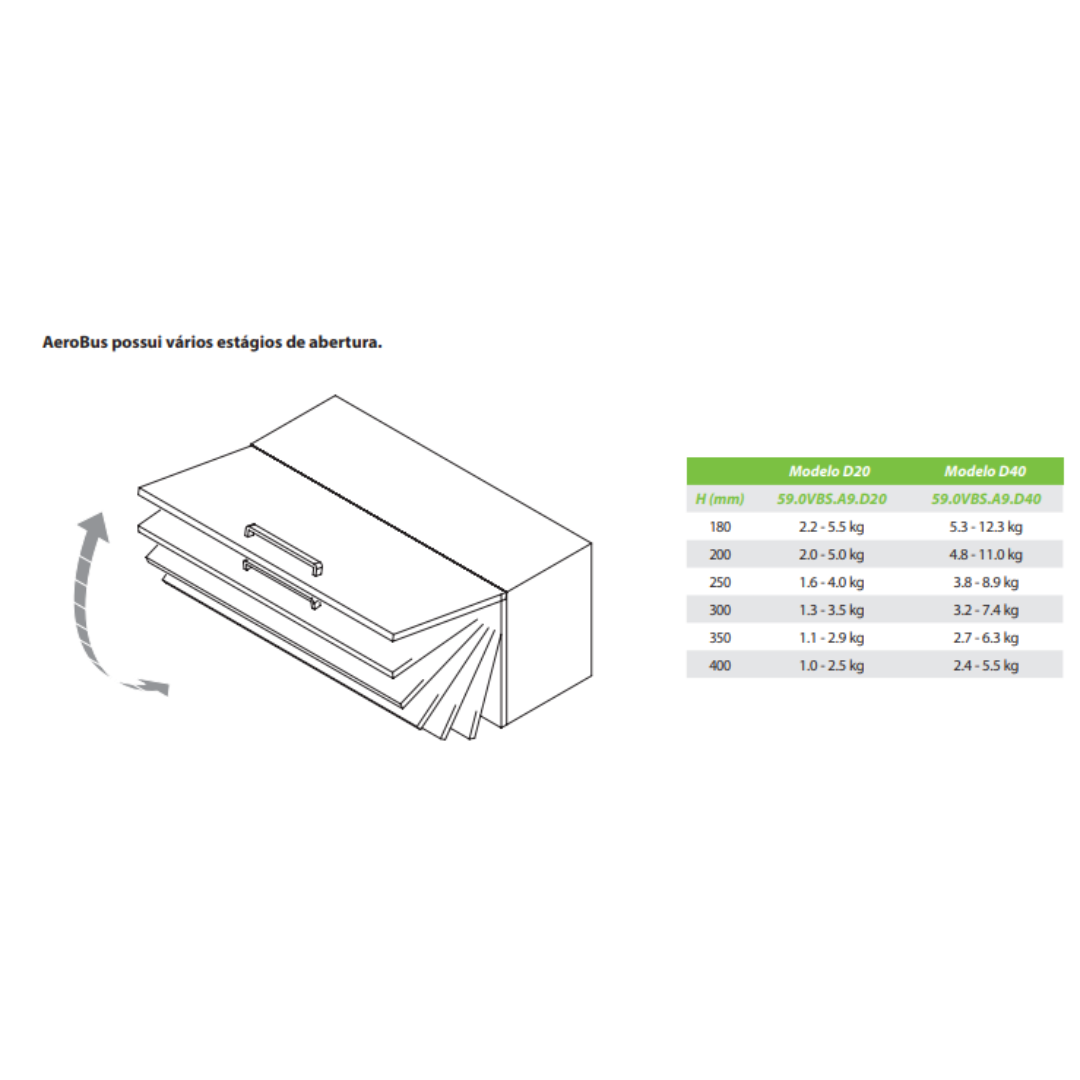 Sistema compacto para abertura de portas verticais e que permite acesso total à parte interna do móvel. Com rápida fixação, dispensa a aplicação de dobradiças e possui sistema de amortecimento acoplado para ajustes precisos, com base no tamanho e peso da porta. É indicado para portas com altura máxima de 400mm, com largura variável e apresenta excelente custo/benefício. Possui estágios de abertura.