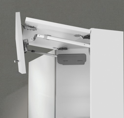 Sistema para abertura de portas bi-partidas de gabinetes aéros, com articulação central e deslocamento vertical superior. Composto de mecanismo com braços articulados que possuem regulagem para movimento suave das portas. O sistema AeroFlex possui mecanismo direito e esquerdo, conectores para as portas, dobradiças superiores, dobradiças para articulação central, kit de fixação e regulagem, manual de instalação e gabarito de montagem para facilitar a instalação. Acompanha também capas para acabamento, na cor cinza.