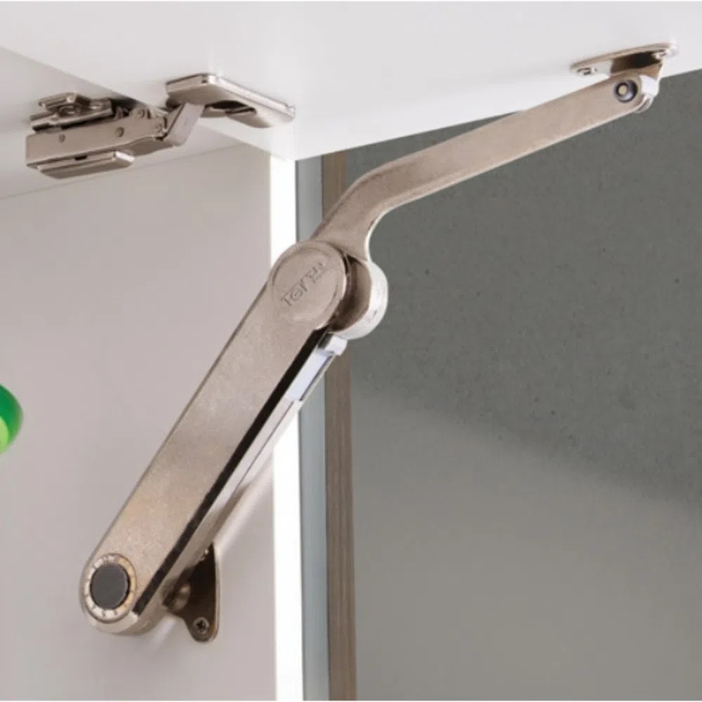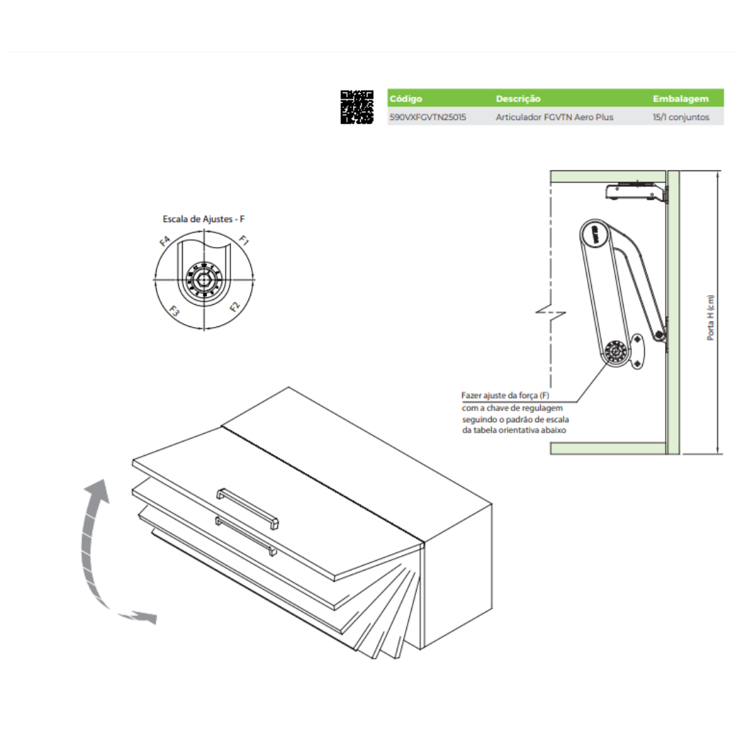 Articulador para elevação de portas basculantes com sistema de regulagem da força, conforme altura e peso da porta. Abertura variável, permitindo parada em qualquer posição.