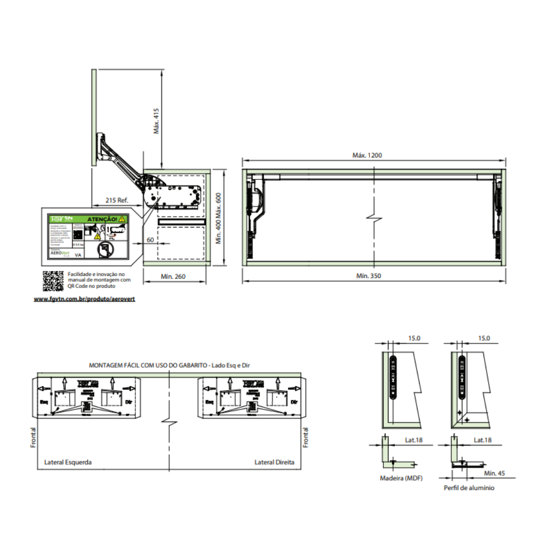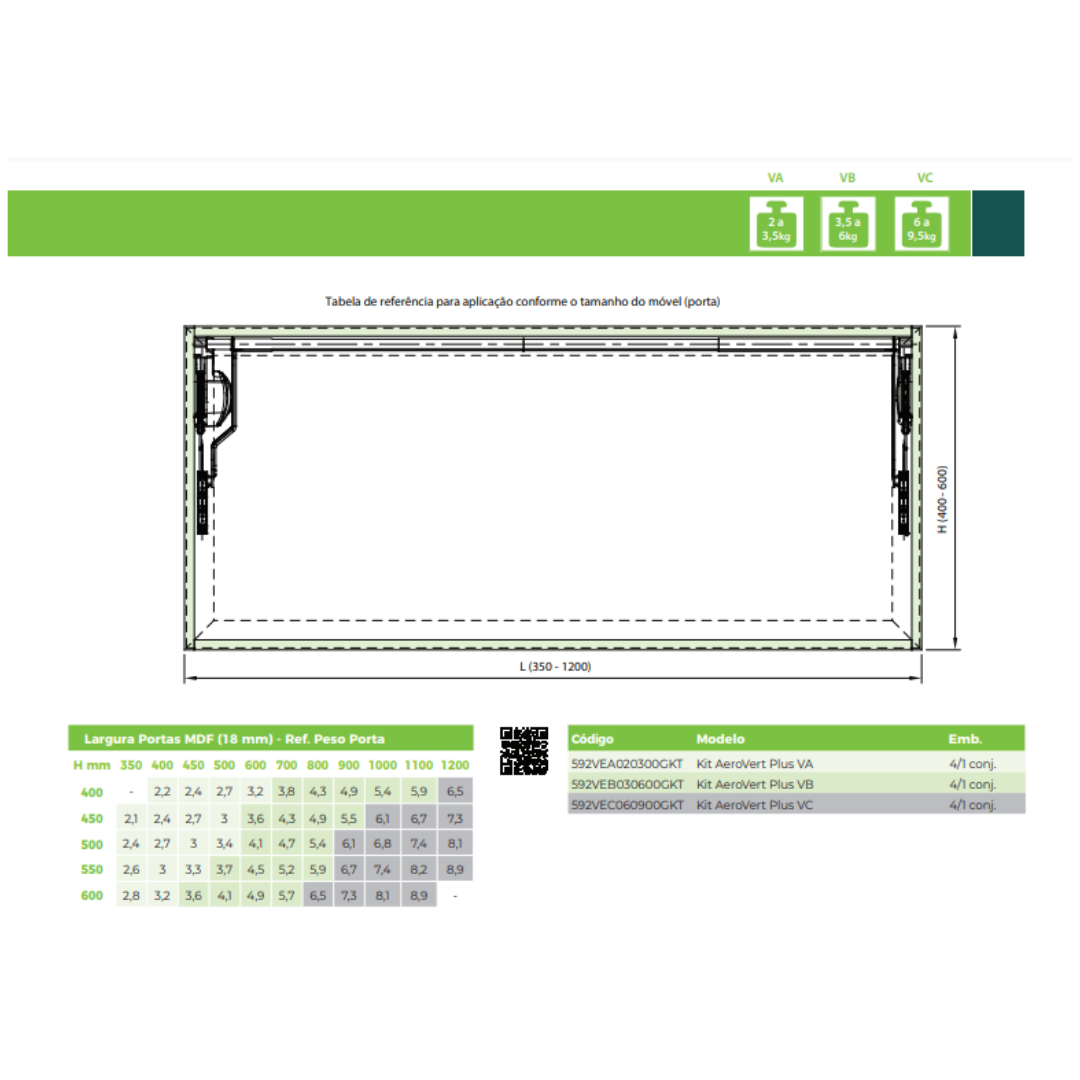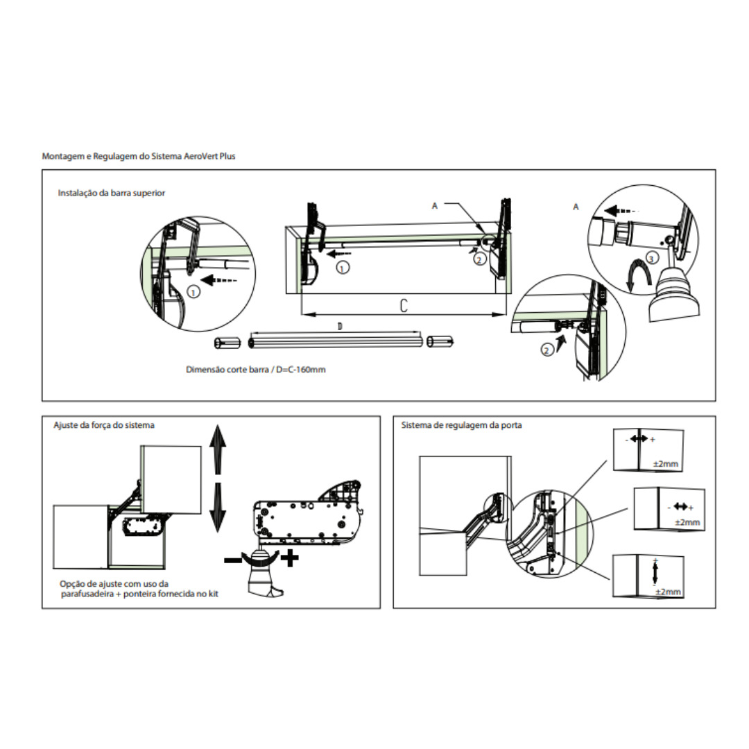 Sistema para abertura de portas aéreas com deslocamento paralelo na elevação superior. Composto de mecanismo com braços articulados que possuem regulagem para movimento suave das portas. O sistema AeroVert Plus possui mecanismo direito e esquerdo, braços articulados, conectores para a porta, kit de fixação e regulagem, manual de instalação e gabarito de montagem para facilitar a instalação. Possui também a barra de interligação dos mecanismos. Acompanha também capas para acabamento, na cor cinza. São 3 opções de força para aplicação conforme tamanho do gabinete e peso das portas.