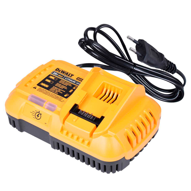Um carregador rápido modelo DCB118-B2 da marca Dewalt. Permite carregar a bateria Flexvolt DCB606 em 60 minutos. Utilizado por marceneiros, montadores de telhado, funileiros, bombeiros, entre outros.